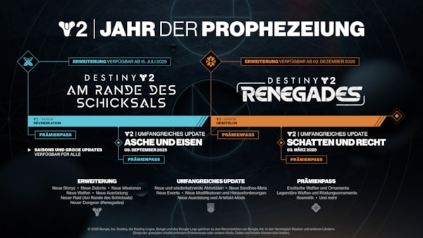 Während des Enthüllungs-Events zu Destiny 2: Am Rande des Schicksals kündigte Bungie auch Destiny 2: Renegades an, die zweite Erweiterung im Jahr der Prophezeiung, die am 2. Dezember 2025 erscheint. Inspiriert vom legendären Star-Wars-Universum, verbindet Renegades die einzigartige Geschichte und das Gameplay von Destiny mit Themen und Elementen aus dem kultigen Science-Fiction-Franchise.