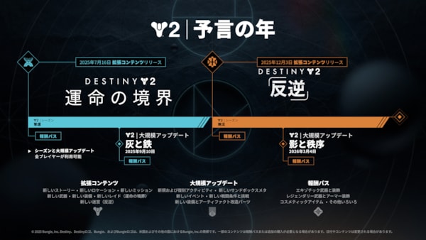 予言の年からは、毎年4つの主要コンテンツ(2つの有料拡張コンテンツとすべてのプレイヤーが利用可能な2つの大規模アップデート)が提供されます。この新しい方式ではシーズンアクティビティにアクセスするための課金は必要なく、すべてのプレイヤーが進化するゲーム世界を一緒に楽しむことができます。