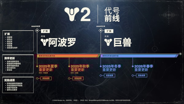 今天,Bungie揭示了《命运2》未来的重大变化,它将采用一种新的模式,在每年推出两个中型扩展和四次免费内容重大更新。这一改进的目标是通过全新多年传奇来增强玩家体验,引入非线性故事、更多系统创新以及对核心游戏活动和奖励的重大改进。从“代号:阿波罗”开始,玩家将开始体验这一新模式。“代号:阿波罗”将于2025年夏季发布,是一部由角色驱动的非线性冒险游戏,也是新扩展模式的首部作品。