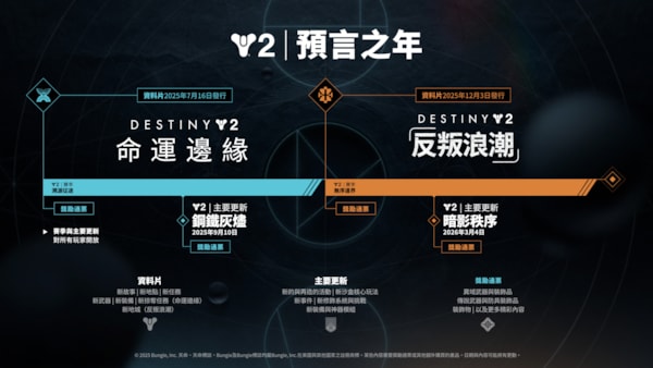 今日,Bungie正式揭曉《預言之年》——《天命》即將到來的新年度內容,包含兩部資料片、核心遊戲更新、重大改版等豐富內容。持續演進的宇宙之最新篇章將由《天命2:命運邊緣》拉開序幕,開啟全新傳奇:命運傳奇。《命運邊緣》資料片將帶領玩家揭開《天命2》史上最神秘的謎團之一,而「九巨頭」將在故事中扮演關鍵角色。《預言之年》將於2025年7月16日隨《天命2:命運邊緣》正式展開,讓守護者們不禁思索:「我們真的是命中註定的存在嗎?」