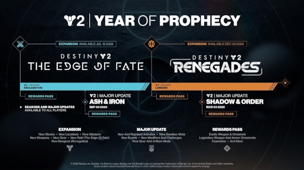 自《預言之年》開始,每年將推出四項主要內容更新,其中包含兩部付費資料片,以及兩次開放給所有玩家的大型更新。這些主要更新將包括全新活動、異域任務、全新裝備和獎勵。鋼鐵灰燼是《命運邊緣》在9月10日即將推出的主要更新,更多細節將在不久後公布。